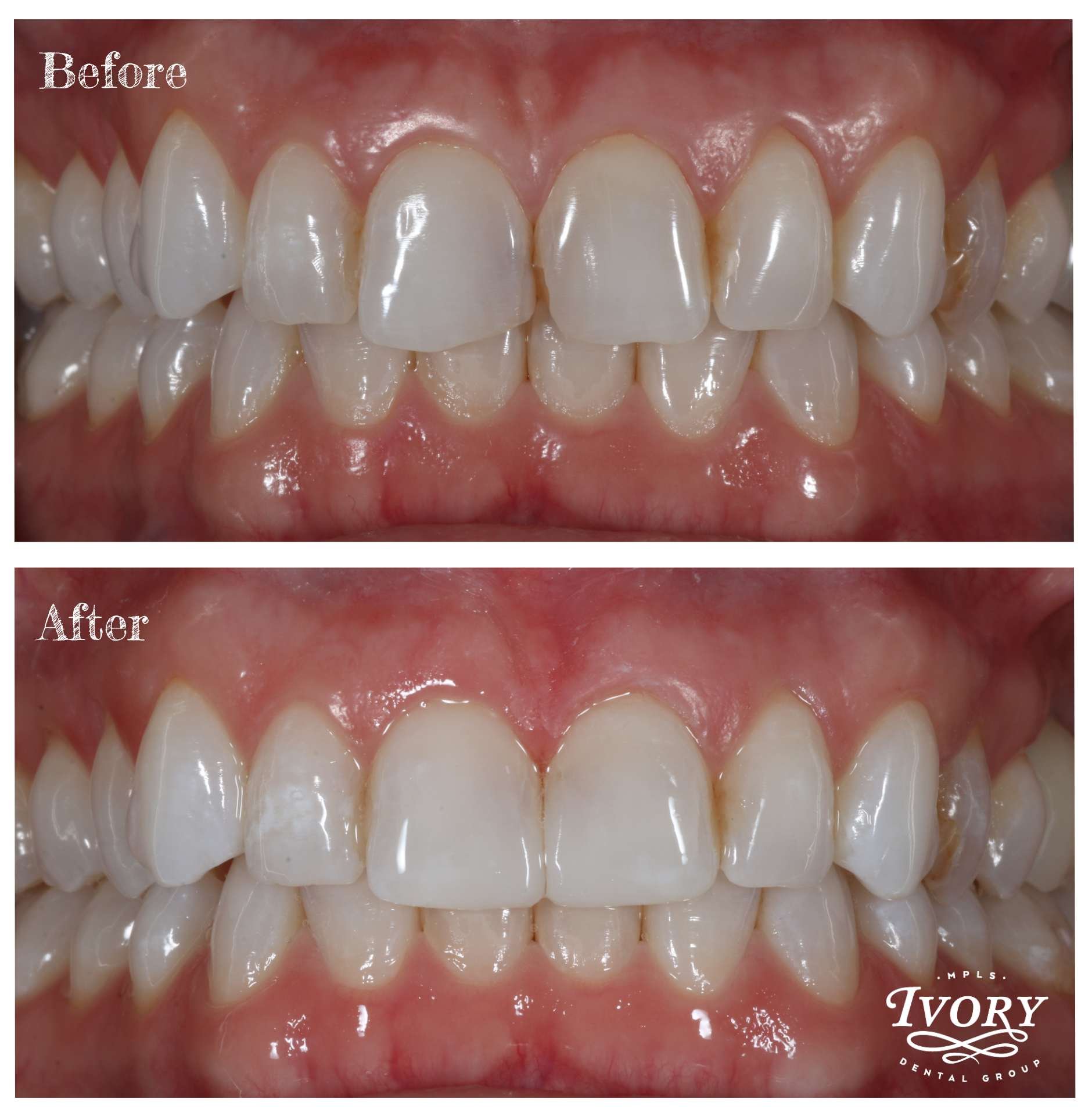 Above is an example of a case we recently completed at Ivory. The patient had old fillings on her front "central incisors” that were chipped and broken down. Her other teeth were beautiful! She noticed that she was unhappy with her smile and her eye was drawn to the chips in the front teeth. I discussed with the patient that the front two teeth are the center point of a smile. Any assymetry or disharmony will stand out on these two teeth. We decided to complete cosmetic bonding on the front two teeth. After the appointment she couldn’t stop smiling! I love dentistry like this - dentistry that helps patients smile confidently!